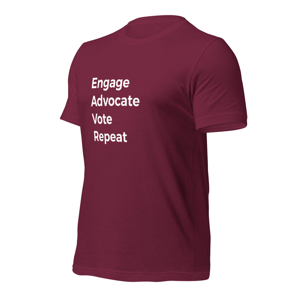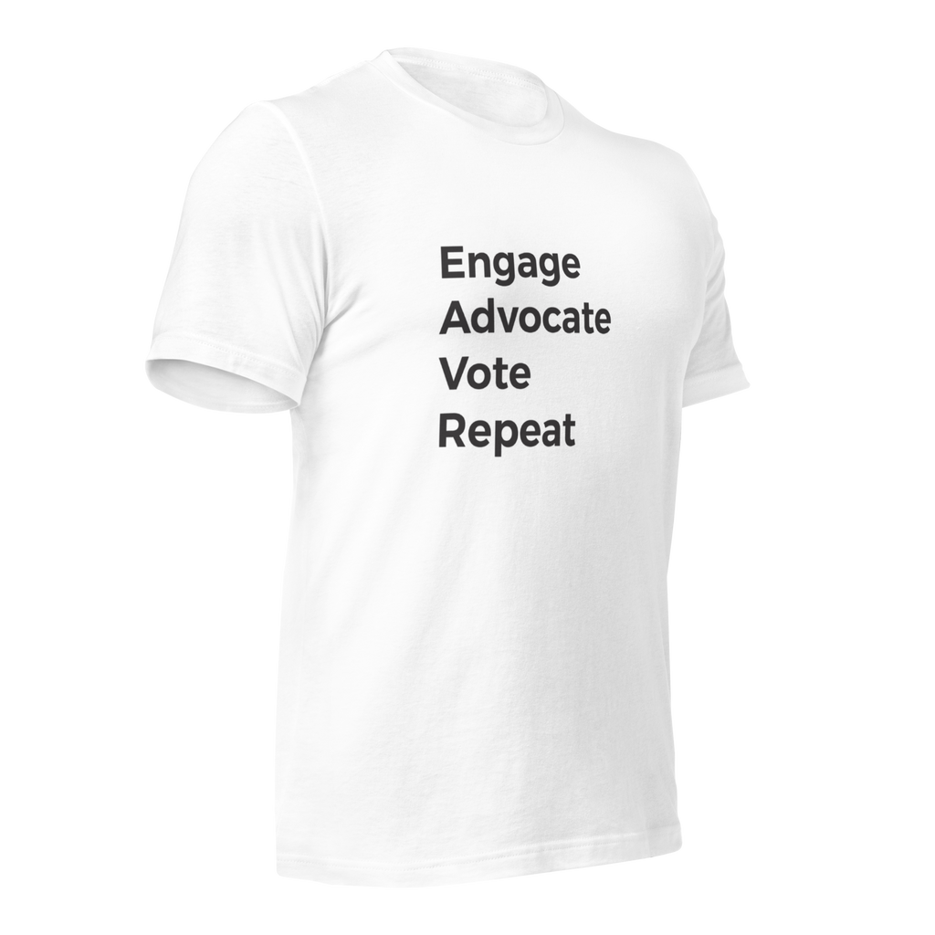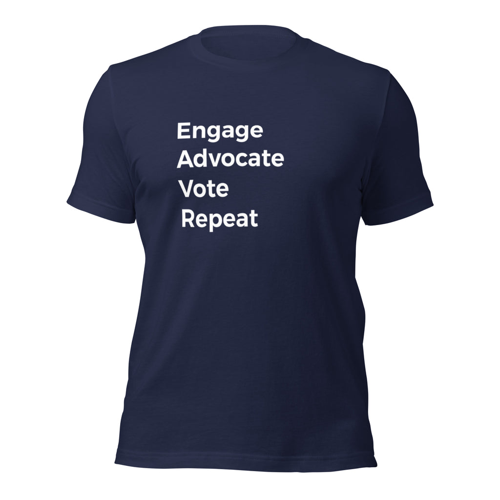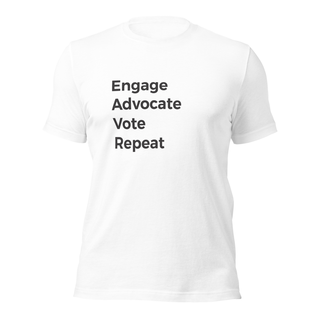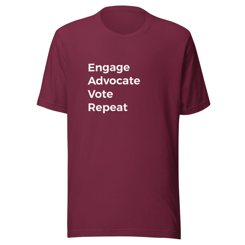 The Engage Advocate Vote Repeat T-Shirt reminds us that democracy is not a one-day event.